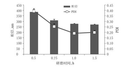 2.1.3研磨時間的篩選稱取BRE原料藥7.5g,置于含有吐溫80(1.125g)的水溶液(22.5mL)中,攪拌混懸,加入氧化鋯珠(粒徑為0.6mm)450g,分別研磨0.5、0.75、1.0、1.5h,制備3批BRE納米晶混懸液。以BRE納米晶混懸液的粒徑、PDI為指標,篩選研磨時間。結果,隨著研磨時間的延長,BRE納米晶混懸液的粒徑、PDI逐漸減小;研磨0.5、0.75、1.0h時,BRE納米晶混懸液的粒徑、PDI減小的幅度較大;研磨1.5h時,BRE納米晶混懸液粒徑雖然較研磨1.0h時的粒徑減小,但減小幅度不大。綜合考慮能耗和時間,確定研磨時間為1h。研磨時間的篩選結果見圖3。
